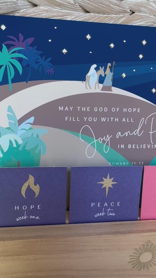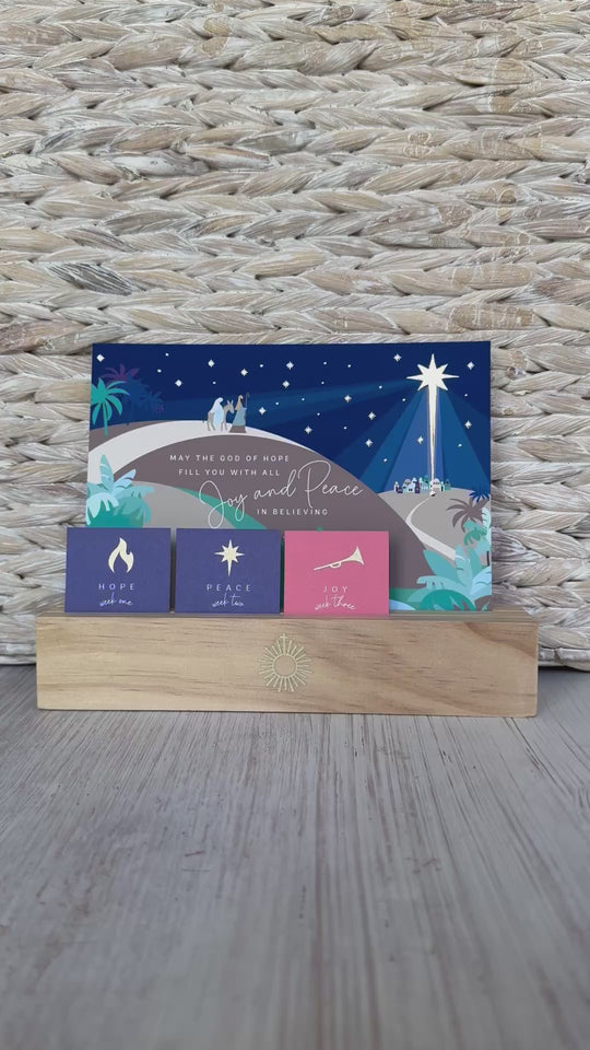 Experience the journey to Bethlehem during the Advent season with a simple, prayerful display. Enjoy a sweet illustration of Mary and Joseph's travels as you prayerfully prepare for Christmas. In our larger set, the artwork is the backdrop to four Advent-themed cards. We offer the option to include a small detailed candle or "Be Still" shelf sitter to enhance your prayer space. Consider using your wood display block base in the future when replacing the artwork with a Marian or Easter-themed print and prayer card.