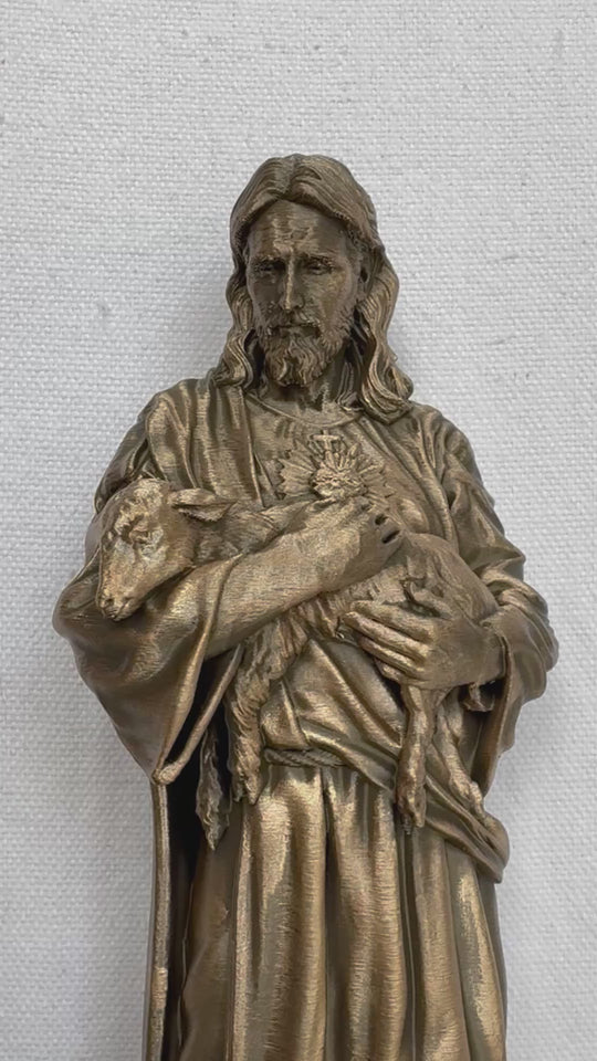 Jesus, our Good Shepherd, actively seeks out, rescues, and carries home has lost sheep, so tenderly and mercifully. Choose from four sizes and two colors - white or painted bronze.