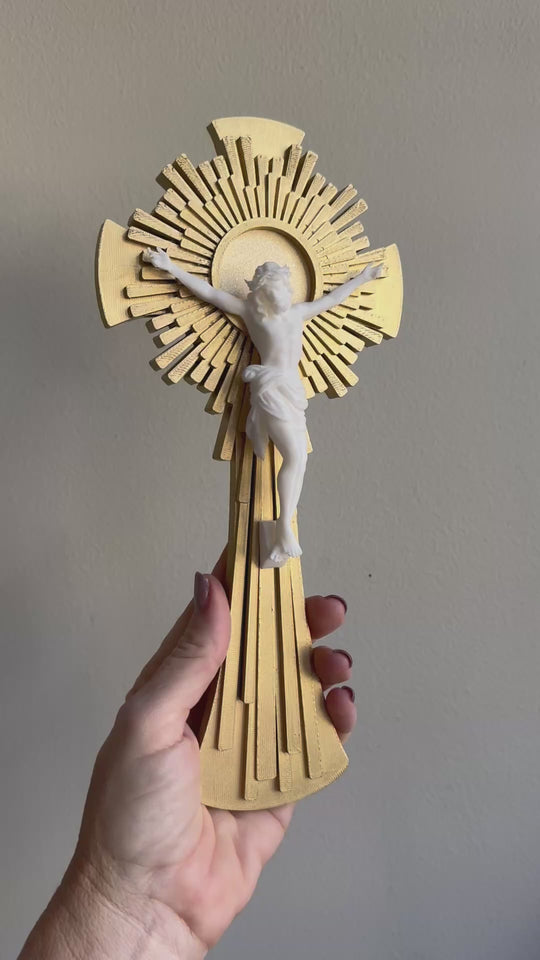 Display this beautiful golden crucifix on your wall. The white corpus of Jesus is detailed and surrounded by a glorious rays, giving the viewer a feeling of reverence and awe.
